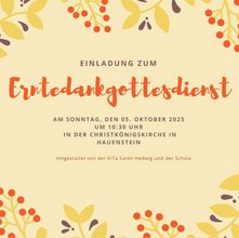 Am Sonntag, den 5. Oktober feiern wir unseren Erntedankgottesdienst um 10.30 Uhr in der Christkönigskirche.