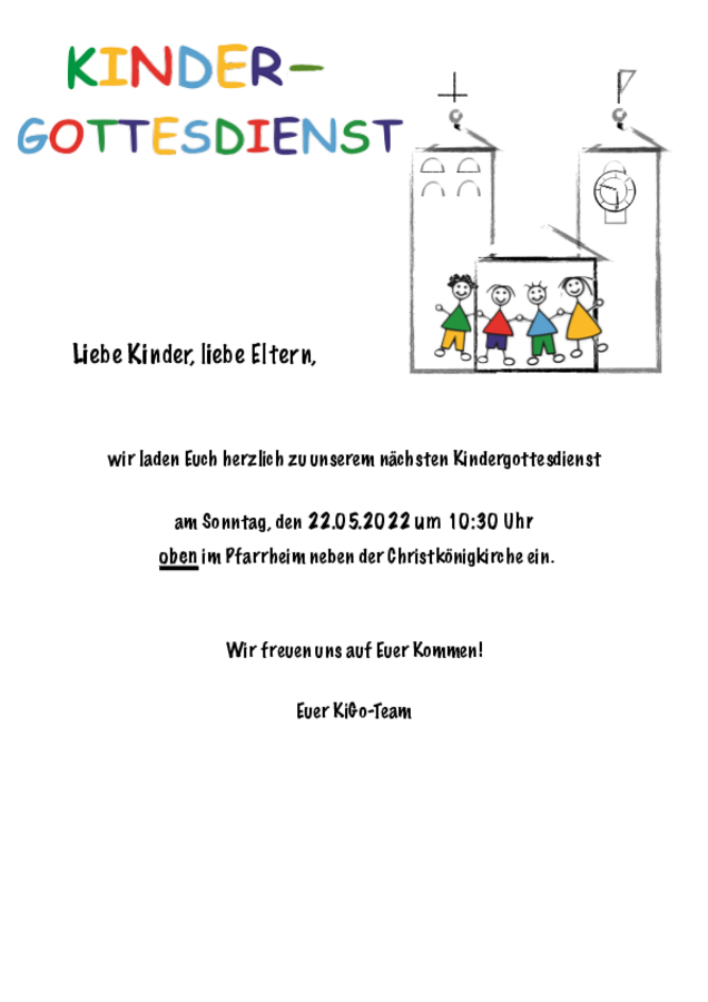 Am Sonntag, den 22.05.22 findet um 10.30 Uhr im Pfarrheim (oberer Eingang) ein Kinderwortgottesdienst statt.